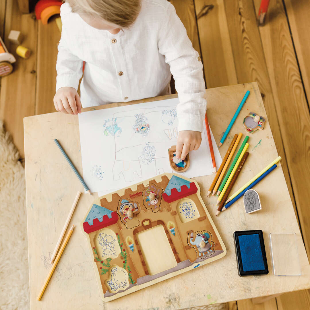 In the dusty attic of the castle, the friends find a box full of costumes. Today Wilma can be queen and invite you to a big dinner! The plug-in puzzle shows the six friends of Bababoo and friends® in medieval garb. The highlight: The back of each puzzle piece works as a stamp! Together with the included ink pad, you can create your own scenarios.