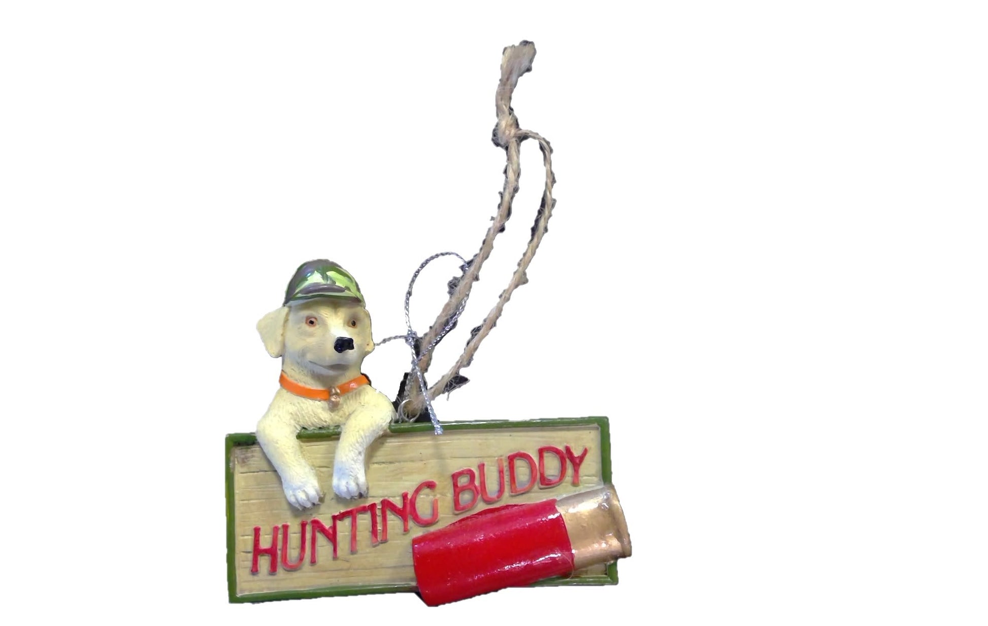 - Yellow lab with camo cap and cartridge with "HUNTING BUDDY" in red font