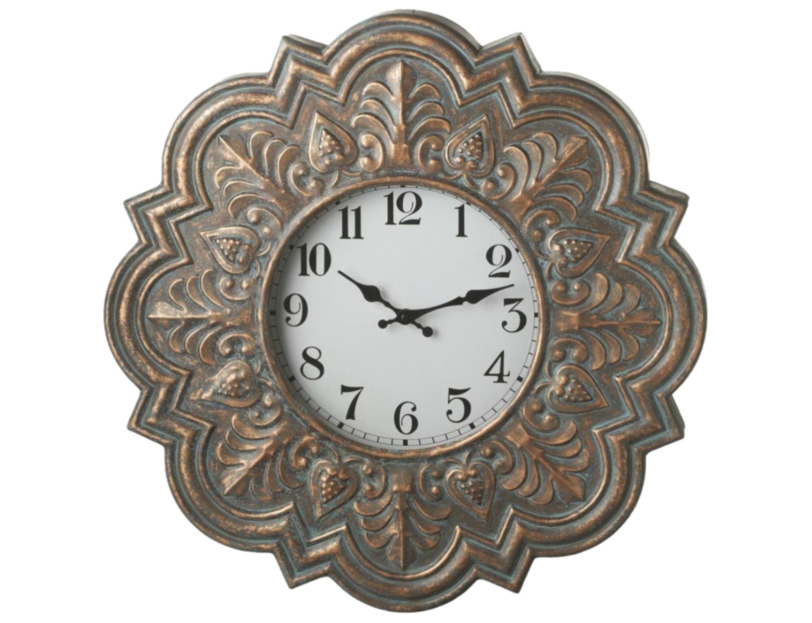 This beautiful, copper-look wall clock is made of iron. Its traditional style will enhance any decor.