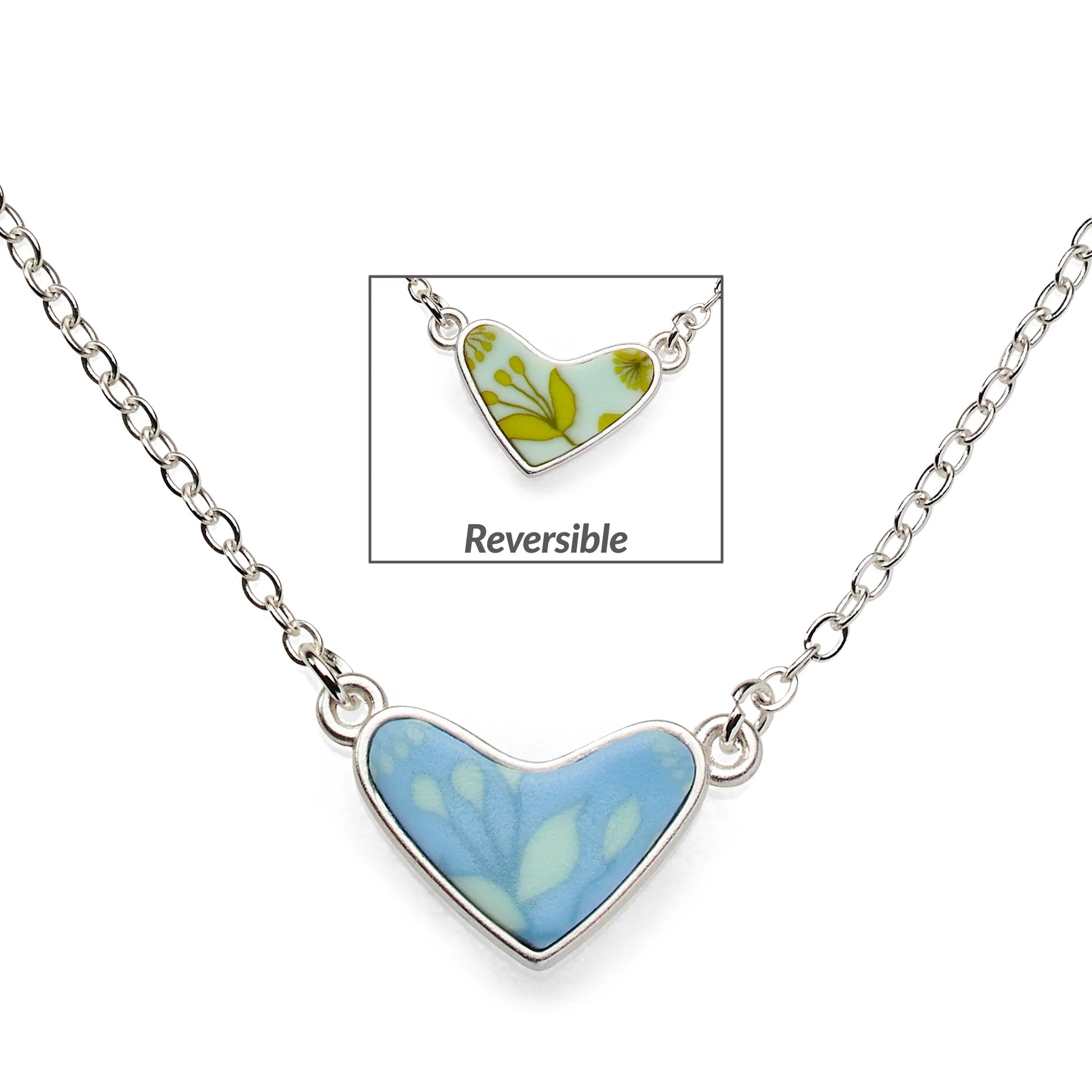 Handcrafted polymer clay inlays nestled in a double-sided heart shaped bezel frame.